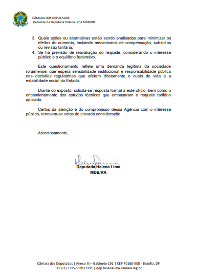 “Não é aceitável que a população de Roraima arque com o maior aumento do Brasil. Energia elétrica é serviço essencial e não pode pesar de forma desproporcional no bolso das famílias”, afirmou a deputada.