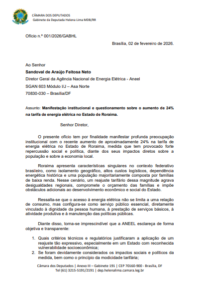 A deputada federal Helena Lima cobrou oficialmente da Agência Nacional de Energia Elétrica (ANEEL) a reavaliação do reajuste de 24,13% na conta de energia elétrica em Roraima, aprovado para o ano de 2026 e considerado o maior aumento registrado no país.